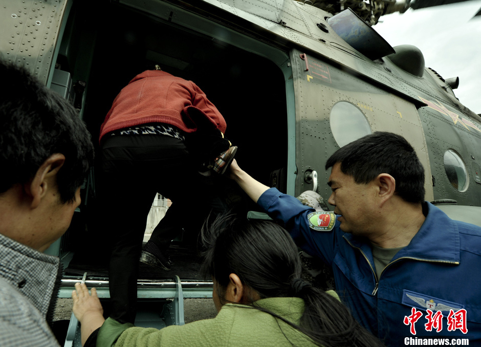 4月24日清晨,四川芦山地震灾区天气局部有好转,成都军区十三集团军陆航旅抗震救灾英雄团的直升机群救灾总动员,多批次多架次飞赴偏辟乡镇抢运救灾物资。图为机组在太平乡抢运伤员。中新社发 贾国荣 摄