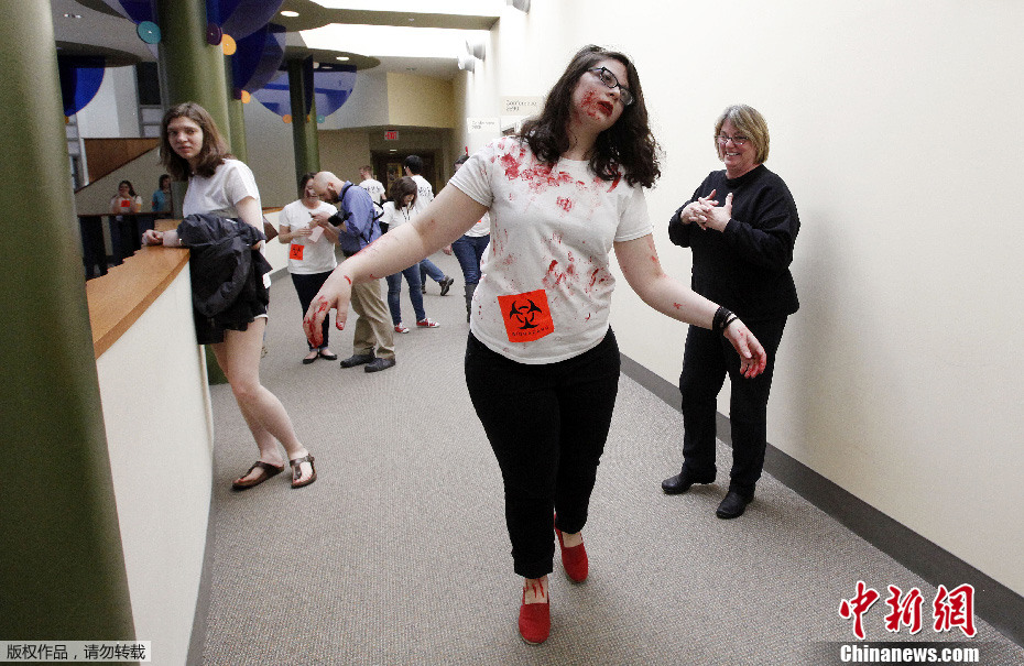 当地时间2013年4月23日,美国密歇根州,密歇根大学的学生扮成僵尸,演绎《僵尸启示录》中的场景,旨在要求学生思考当灾难来袭时该如何正确应对。