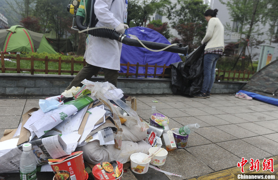 4月24日,防疫工作人员正在对四川芦山县城各安置点进行消毒处理,地震灾区防疫工作已经全面铺开。中新社发 张浪 摄