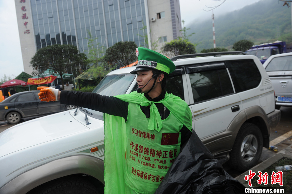 4月24日,一名来自四川的环保志愿者尹春龙在芦山县城,戴着绿帽、穿着绿衣,向安置点民众和参加抢险救援的工作人员宣传环保理念,并陆续向他们发放自己购买的10000个环保袋。中新社发 张浪 摄
