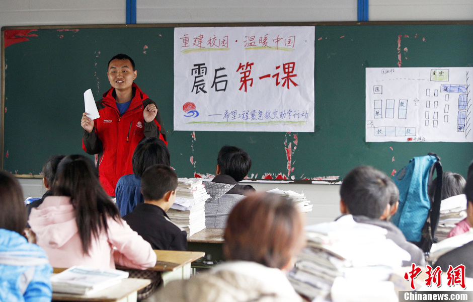 4月24日,四川芦山地震后首所板房学校在国张中学复课,志愿者正在为同学上震后第一课。这是中国青少年发展基金会等援建的第一所“抗震希望学校”,而国张中学的原校舍在地震中严重损毁,两栋教学楼、两栋宿舍均成为危房。中新社发 张浩 摄