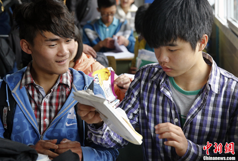 4月24日,四川芦山地震后首所板房学校在国张中学复课,两位同学开始翻阅从旧教室抢救出来的课本。这是中国青少年发展基金会等援建的第一所“抗震希望学校”,而国张中学的原校舍在地震中严重损毁,两栋教学楼、两栋宿舍均成为危房。中新社发 张浩 摄