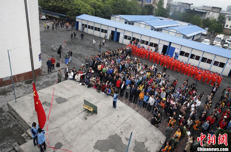 4月24日,四川芦山地震后首所板房学校在国张中学复课,志愿者正在为同学上震后第一课。这是中国青少年发展基金会等援建的第一所“抗震希望学校”,而国张中学的原校舍在地震中严重损毁,两栋教学楼、两栋宿舍均成为危房。中新社发 张浩 摄