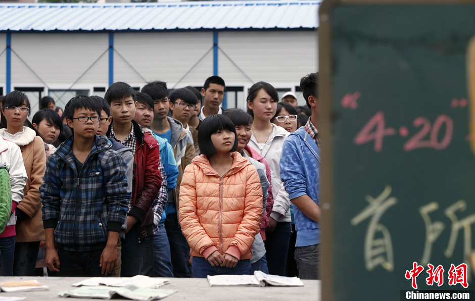 4月24日,四川芦山地震后首所板房学校在国张中学复课,志愿者正在为同学上震后第一课。这是中国青少年发展基金会等援建的第一所“抗震希望学校”,而国张中学的原校舍在地震中严重损毁,两栋教学楼、两栋宿舍均成为危房。中新社发 张浩 摄