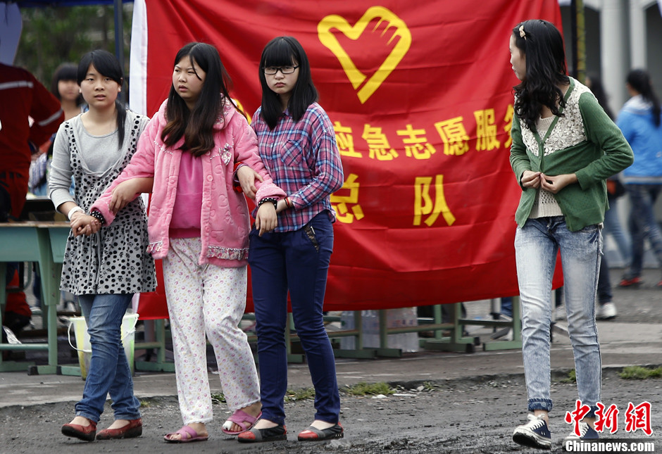 4月24日,四川芦山地震后首所板房学校在国张中学复课,志愿者正在为同学上震后第一课。这是中国青少年发展基金会等援建的第一所“抗震希望学校”,而国张中学的原校舍在地震中严重损毁,两栋教学楼、两栋宿舍均成为危房。中新社发 张浩 摄