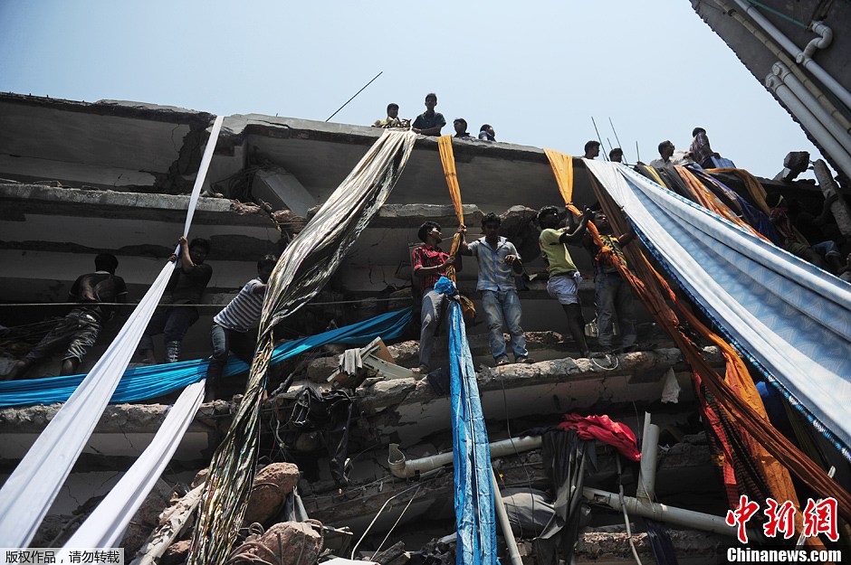 当地时间4月24日,孟加拉首都达卡郊区的一座八层建筑物倒塌。据路透社报道,截至目前事故已造成至少70人丧生,数百人受伤。消防队员和军队正在营救被困人员。建筑物内有一家制衣工厂和一座商业中心。当地警方负责人称,建筑物昨天出现裂缝,但业主没有理会不得让工人进入建筑物的警告。图为民众逃离倒塌的建筑。