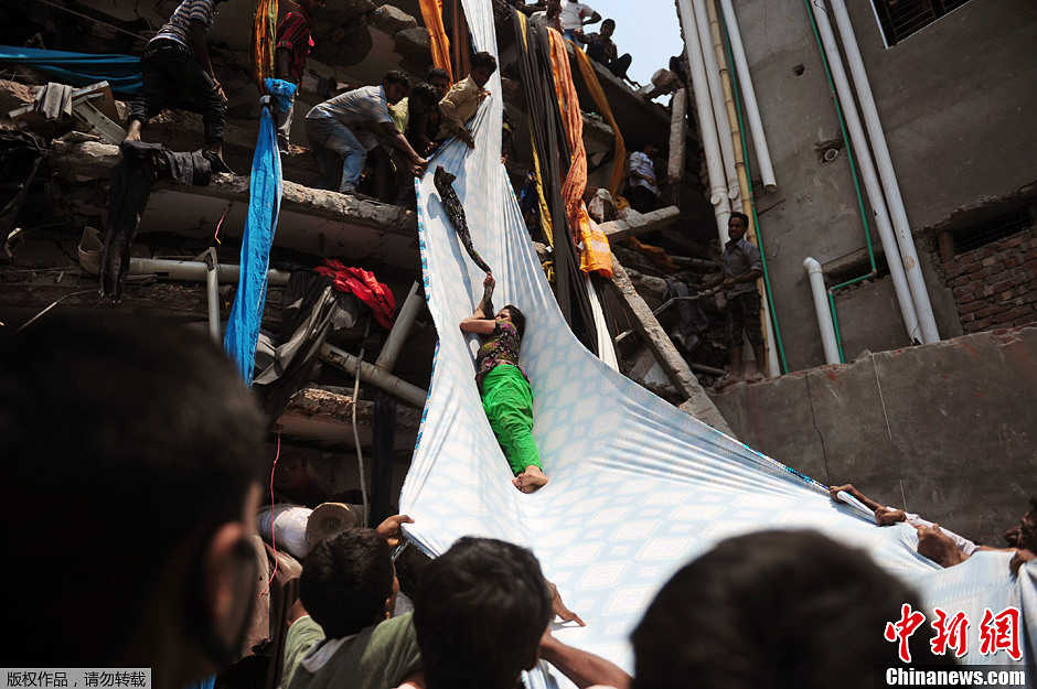 当地时间4月24日,孟加拉首都达卡郊区的一座八层建筑物倒塌。据路透社报道,截至目前事故已造成至少70人丧生,数百人受伤。消防队员和军队正在营救被困人员。建筑物内有一家制衣工厂和一座商业中心。当地警方负责人称,建筑物昨天出现裂缝,但业主没有理会不得让工人进入建筑物的警告。图为民众逃离倒塌的建筑。