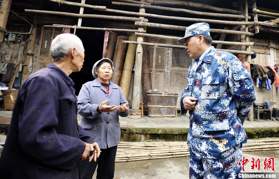 4月24日,成都军区空军抗震救灾前进指挥所指挥长蔡伟素少将带队走进四川芦山龙门乡指房村入户了解受灾群众生活情况,为受灾群众解决实际困难。中新社发 安源 摄