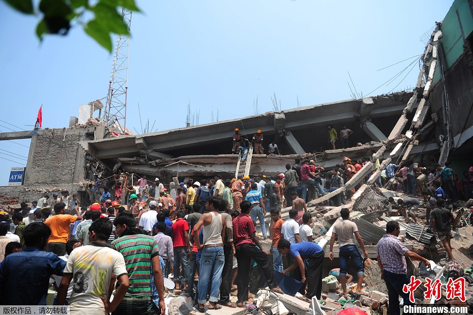 当地时间4月24日,孟加拉首都达卡郊区的一座八层建筑物倒塌。据路透社报道,截至目前事故已造成至少70人丧生,数百人受伤。消防队员和军队正在营救被困人员。建筑物内有一家制衣工厂和一座商业中心。当地警方负责人称,建筑物昨天出现裂缝,但业主没有理会不得让工人进入建筑物的警告。图为救援人员在现场实施救援。