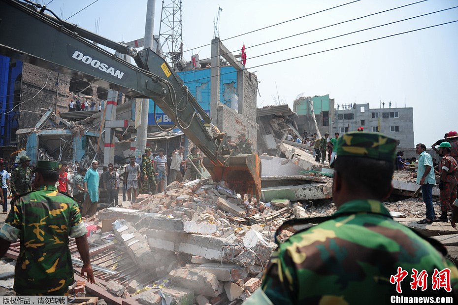 当地时间4月24日,孟加拉首都达卡郊区的一座八层建筑物倒塌。据路透社报道,截至目前事故已造成至少70人丧生,数百人受伤。消防队员和军队正在营救被困人员。建筑物内有一家制衣工厂和一座商业中心。当地警方负责人称,建筑物昨天出现裂缝,但业主没有理会不得让工人进入建筑物的警告。图为救援人员在现场实施救援。
