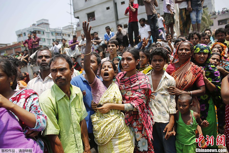 当地时间4月24日,孟加拉首都达卡郊区的一座八层建筑物倒塌。据路透社报道,截至目前事故已造成至少70人丧生,数百人受伤。消防队员和军队正在营救被困人员。建筑物内有一家制衣工厂和一座商业中心。当地警方负责人称,建筑物昨天出现裂缝,但业主没有理会不得让工人进入建筑物的警告。图为被困人员家属焦急等待着信息。