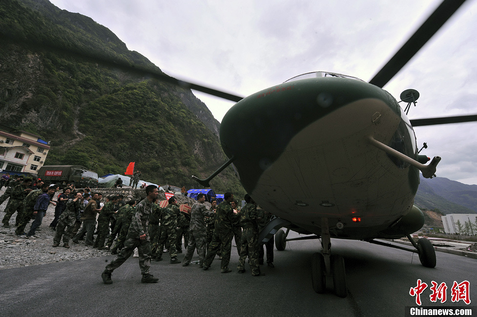 4月24日中午,四川芦山地震灾区天气转晴,成都军区十三集团军陆航旅抗震救灾英雄团的直升机群,多批次多架次升空。图为副参谋长时全盛机组降落在重灾区宝兴县公路上抢运救灾物资。中新社发 贾国荣 摄
