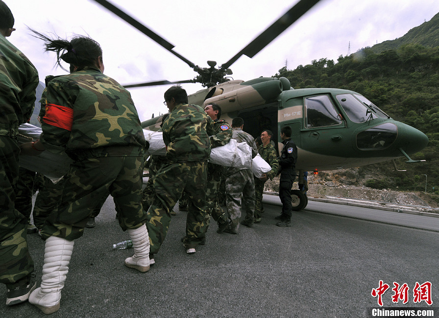 4月24日中午,四川芦山地震灾区天气转晴,成都军区十三集团军陆航旅抗震救灾英雄团的直升机群,多批次多架次升空。图为副参谋长时全盛机组降落在重灾区宝兴县公路上抢运救灾物资。中新社发 贾国荣 摄