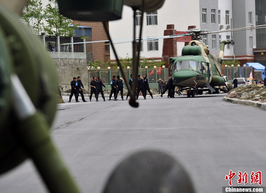 4月24日中午,四川芦山地震灾区天气转晴,成都军区十三集团军陆航旅抗震救灾英雄团的直升机群,多批次多架次升空。图为副参谋长时全盛率领的双机组,降落在重灾区宝兴县公路上抢运救灾物资。中新社发 贾国荣 摄