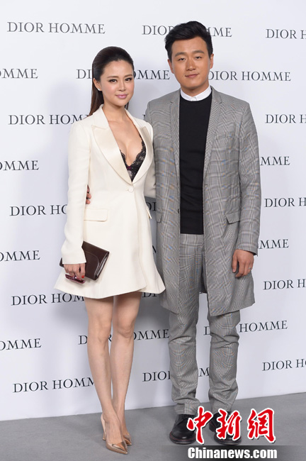 2013年4月25日晚,DIOR男装2013秋冬系列发布会在北京举行。黄晓明、邓超、韩庚、佟大为夫妇、张歆艺等众星到场助阵,红地毯星光熠熠。图为佟大为、关悦夫妇。中新社发 李学仕 摄