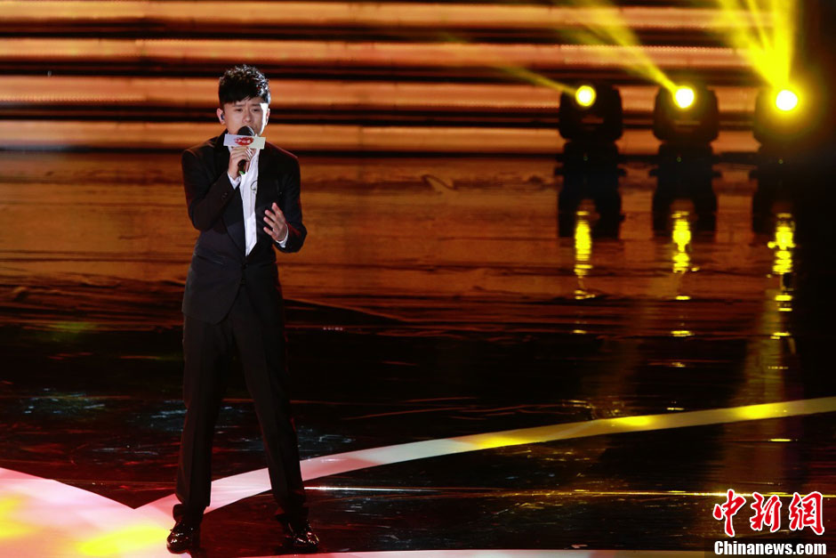 4月28日,“中国爱·420芦山强烈地震”大型公益晚会晚会举行,此次直播由陈晓楠、郑浩、王洋、张国立担任主持,在正式开始前,主持人、众明星与现场观众全体默哀一分钟,沉痛悼念芦山地震的遇难者。图为张杰演唱《最美的太阳》。四川网络广播电视台供图