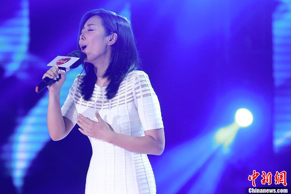 4月28日,“中国爱·420芦山强烈地震”大型公益晚会晚会举行,此次直播由陈晓楠、郑浩、王洋、张国立担任主持,在正式开始前,主持人、众明星与现场观众全体默哀一分钟,沉痛悼念芦山地震的遇难者。图为孙悦演唱《祝你平安》。四川网络广播电视台供图