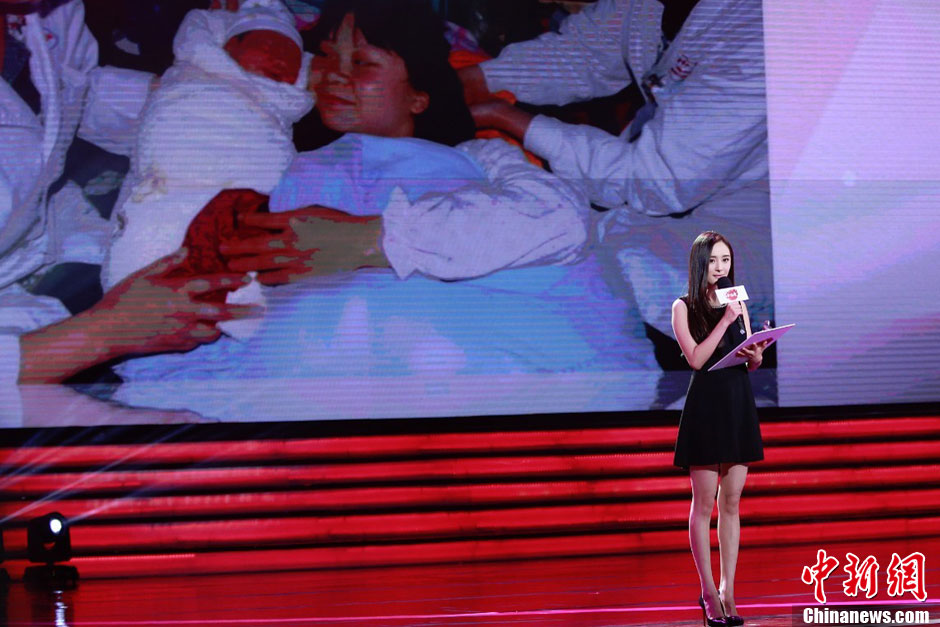 4月28日,“中国爱·420芦山强烈地震”大型公益晚会晚会举行,此次直播由陈晓楠、郑浩、王洋、张国立担任主持,在正式开始前,主持人、众明星与现场观众全体默哀一分钟,沉痛悼念芦山地震的遇难者。图为杨幂。四川网络广播电视台供图