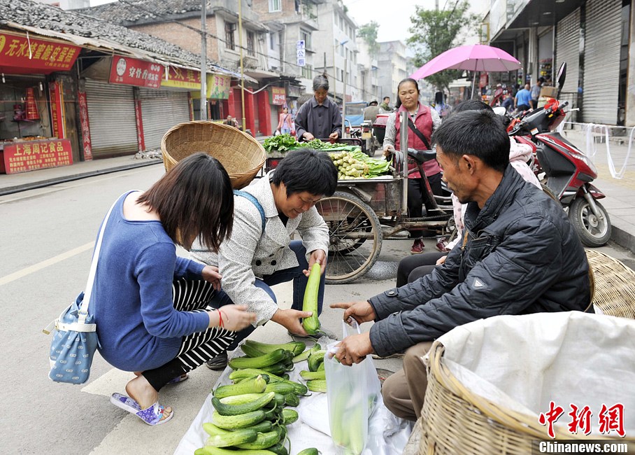 4月28日,重灾区芦山县的十字路口逐渐恢复往日的“繁华”。强烈的七级地震吓跑了十字路口附近的商贩,只留下一片站立的废墟。震后第九天,菜摊、水果摊、小百货店、卤菜档、副食品摊等分布于十字路口的四周,来往的人群让这个曾经繁华之地渐聚人气。图为芦山居民正在选购蔬菜。安源 摄