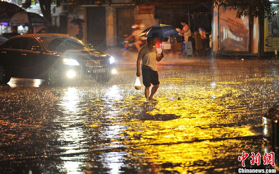 4月28日晚,一场大范围的强降雨袭击重庆,不少车辆和市民被困雨中,主城内多处路段积水严重。重庆市气象台紧急对外发布了“暴雨蓝色预警”、“雷电黄色预警”信号。中新社发 陈超 摄