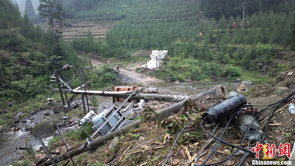 4月29日1时30分左右,四川巴中、泸州等遭遇雷暴雨天气,其中平昌城内多株大树被大风吹倒,大风暴雨还造成电力、通讯等设施受严重。图为被吹倒的电力、通讯线路和设施。中新社发 安宗斌 摄