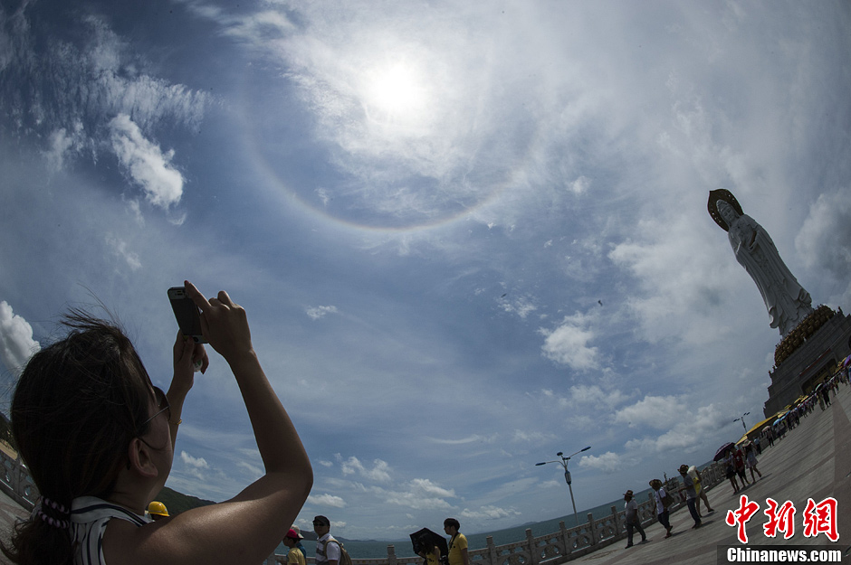 4月29日,海南三亚上空出现罕见的日晕奇观,在三亚南山景区108米海上观音像前,不少游客驻足观看这一奇景。中新社发 骆云飞 摄