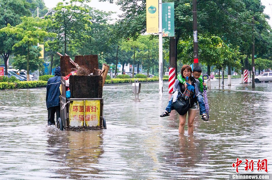 4月29日上午,广西钦州出现短时强降雨,造成了市区部分道路积水严重,给出行的人们带来极大的不便。气象监测显示,当天2时至8时钦州城区6小时降雨量达52.8毫米。图为钦州城区出现“水浸街”。李斌喜 摄