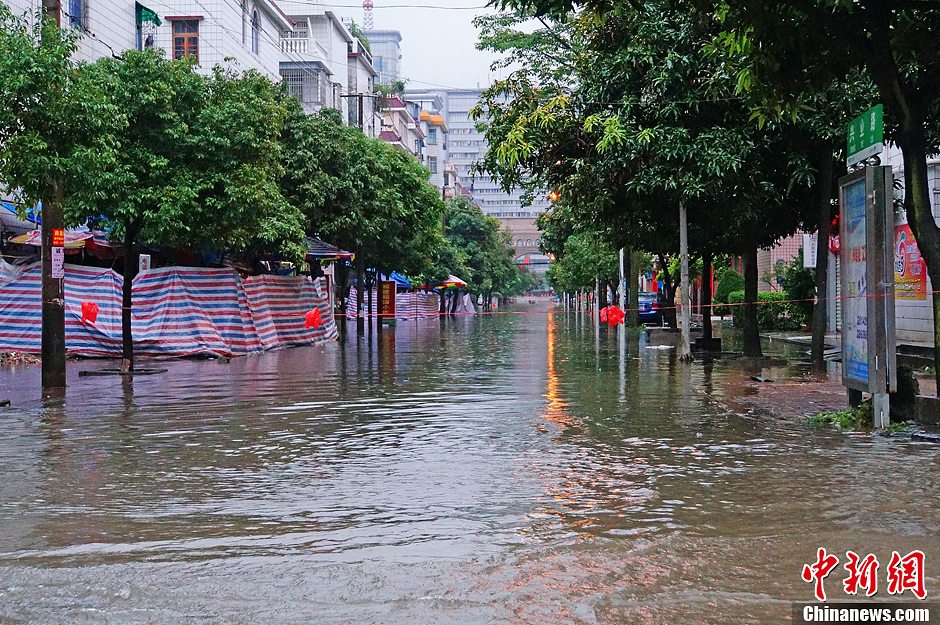 4月29日上午,广西钦州出现短时强降雨,造成了市区部分道路积水严重,给出行的人们带来极大的不便。气象监测显示,当天2时至8时钦州城区6小时降雨量达52.8毫米。图为钦州城区出现“水浸街”。李斌喜 摄