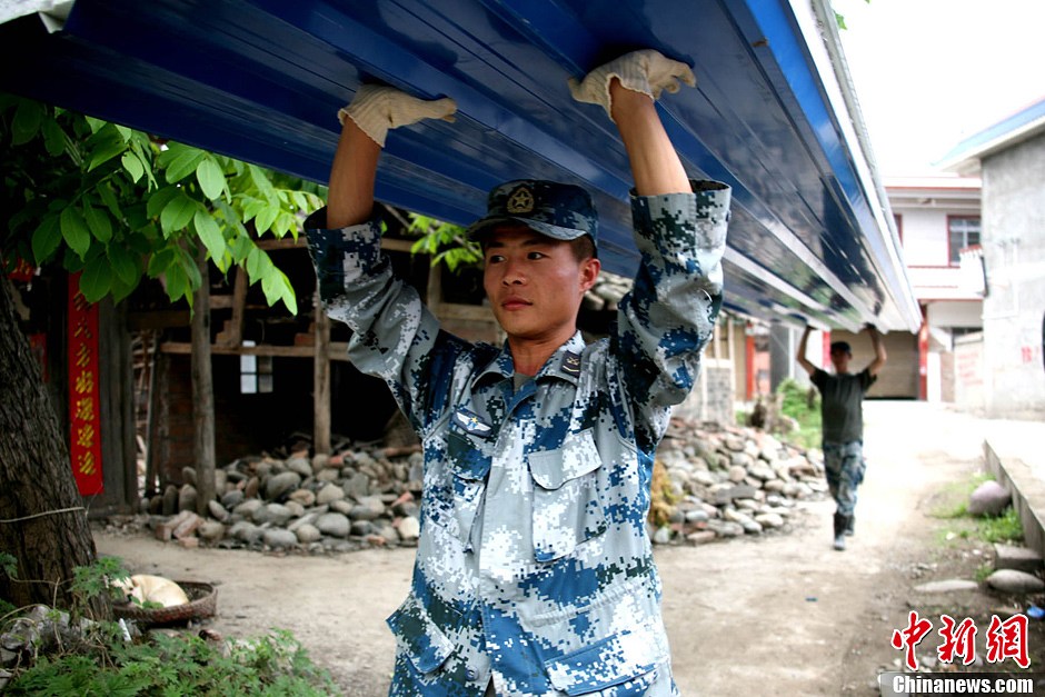 空军第九工程总队官兵为震区孤寡老人搭建板房