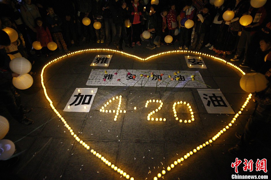 4月29日晚,河南南阳,上千民众在南阳市旅游协会的倡导下,聚集在诸葛亮躬耕地南阳卧龙岗,点亮烛光以及新型孔明灯,中间围着签名条幅和鲜花,组成“心形”,寄托对雅安震区遇难民众的哀思,传达对雅安重建的祝福。中新社发 王中举 摄