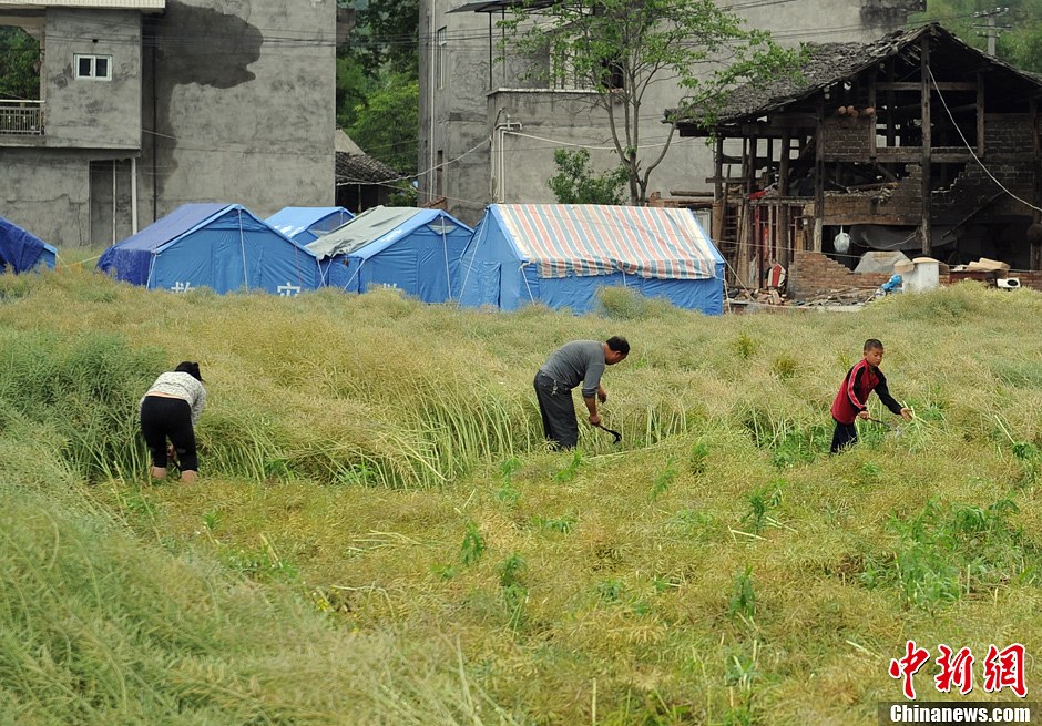 4月30日,四川芦山震灾区的村民正在地里收割油菜。当日,四川芦山震灾区进入双抢大忙时节,清仁乡同盟村的受灾民众正在抢收油菜。中新社发 刘忠俊 摄