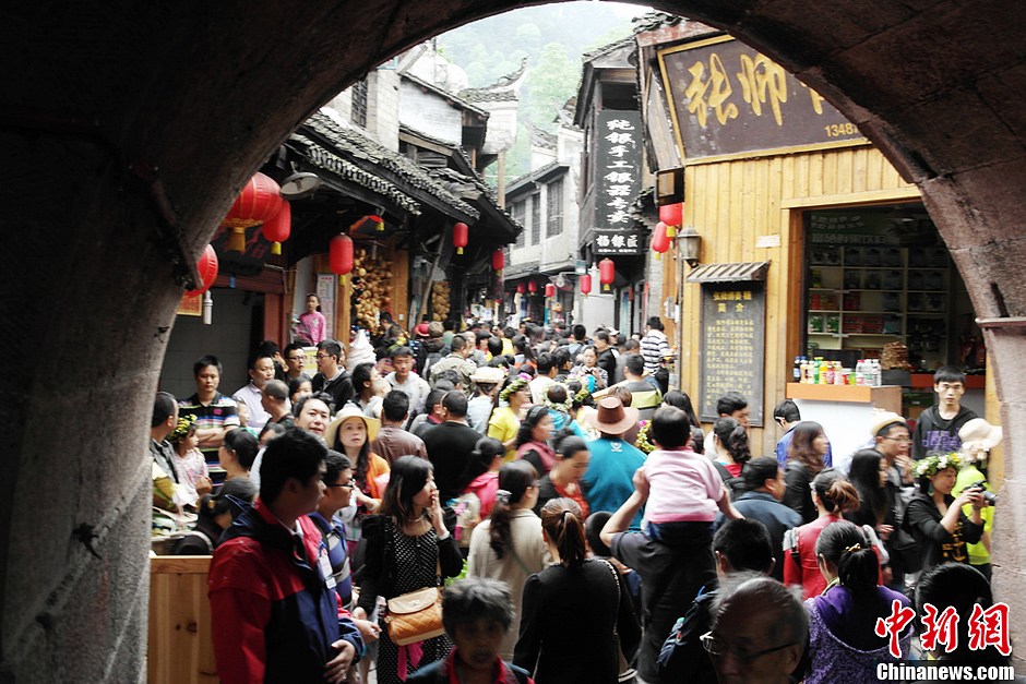 4月30日,是“五一”小长假第二日,记者走访发现,当天来湖南凤凰古城的游客数量比起前几日有了较大的增长,古城内游客摩肩接踵走在各大小街头。一位来自广东的游客表示,因为凤凰古城太美收不收门票还是会来凤凰,只是希望门票能回归理性,这样才能给商户和游客带来双赢。由于游客众多,行人通过城门口的速度较缓慢。杨华峰 摄