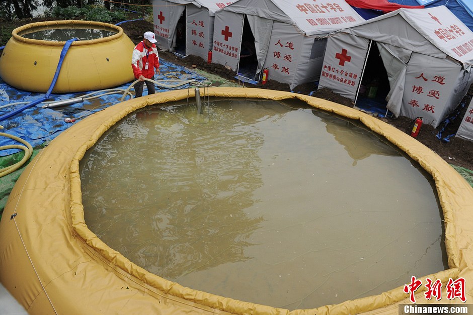 4月30日,湖南红十字会志愿者正在储水净水设备前忙碌,该套水处理现场解决了芦山震区龙门乡五星村民众日常吃水难问题。据悉,该设备由湖南省红十字会捐献,蓄水量为70吨。中新社发 刘忠俊 摄