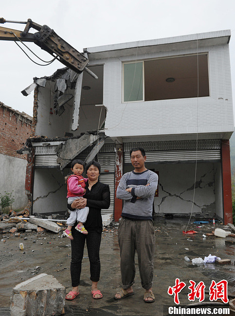 4月30日,一大型机械开始对芦山县龙门乡山溪沟组骆春龙家受损的房屋进行拆除。四川芦山“4.20”7级强震发生后,骆春龙贷款修的二层小楼房在地震中受损严重,如今一家人只能住在帐篷中。中新社发 刘忠俊 摄