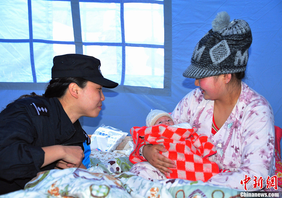 4月30日,周媛看望帮助的孕妇。四川芦山“4.20”7级强震发生后,乐山市公安局特巡警支队女警花周媛被紧急派往灾区执行任务,期间其情系灾区民众,帮助孩子们建立公安帐篷学校,并利用休息时间义务教孩子们弹电子琴、唱歌等,执行任务期间还积极帮助灾民解决生活困难,被灾区民众称为最美女“警花”。中新社发 刘忠俊组稿