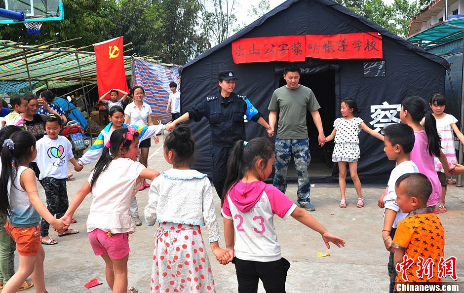 4月30日,周媛与孩子们一起玩游戏。四川芦山“4.20”7级强震发生后,乐山市公安局特巡警支队女警花周媛被紧急派往灾区执行任务,期间其情系灾区民众,帮助孩子们建立公安帐篷学校,并利用休息时间义务教孩子们弹电子琴、唱歌等,执行任务期间还积极帮助灾民解决生活困难,被灾区民众称为最美女“警花”。中新社发 刘忠俊组稿
