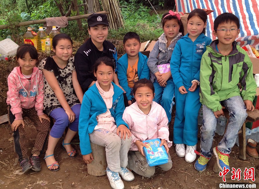4月30日,乐山市公安局特巡警支队女警花周媛与她的学生们。四川芦山“4.20”7级强震发生后,乐山市公安局特巡警支队女警花周媛被紧急派往灾区执行任务,期间其情系灾区民众,帮助孩子们建立公安帐篷学校,并利用休息时间义务教孩子们弹电子琴、唱歌等,执行任务期间还积极帮助灾民解决生活困难,被灾区民众称为最美女“警花”。中新社发 刘忠俊组稿