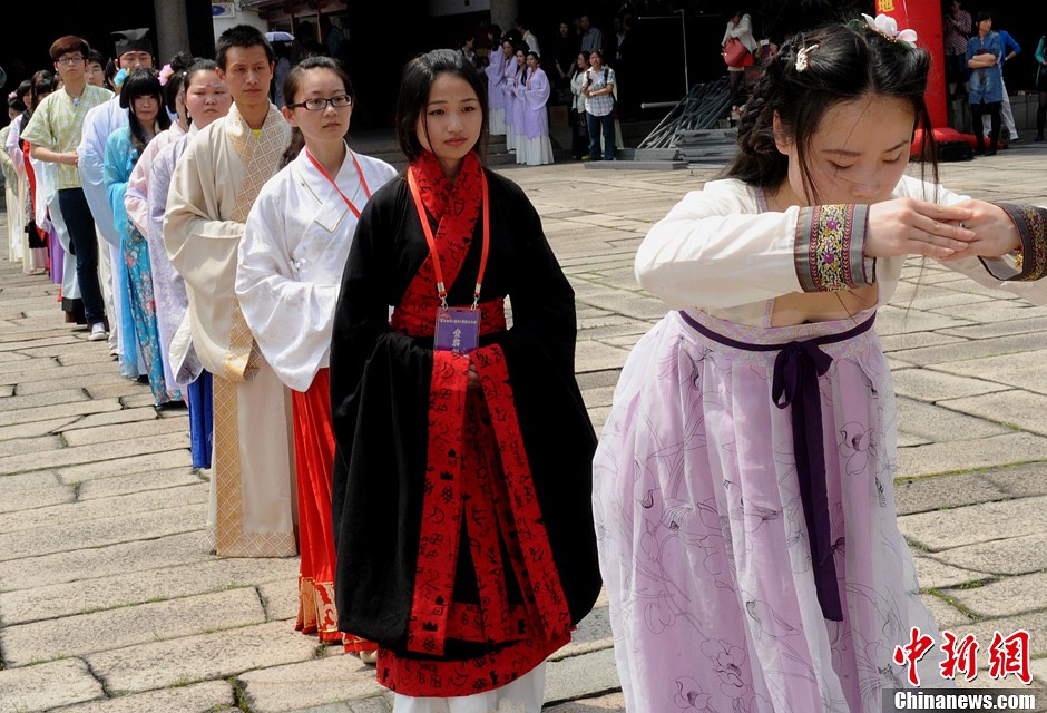 4月30日,首届海峡两岸(福州)汉服文化节在福州文庙举行揭幕仪式,台湾知名人士宋楚瑜送来亲笔致庆题词:推广汉服文化,展现民族特色。本届汉服文化节吸引了两岸70余家汉服社团近200名代表参与。来自北京、上海、广东、福建等省市及台湾地区的多个汉服制作团队,也来到千年古城福州展示汉服之美。台湾传统文化促进协会、台湾鹿山文社、台湾中华汉服文化创意发展协会、台湾中华大汉汉服协会等台湾社团参加了本届汉服文化节。中新社发 刘可耕 摄