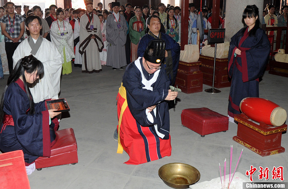 4月30日,首届海峡两岸(福州)汉服文化节在福州文庙举行揭幕仪式,台湾知名人士宋楚瑜送来亲笔致庆题词:推广汉服文化,展现民族特色。本届汉服文化节吸引了两岸70余家汉服社团近200名代表参与。来自北京、上海、广东、福建等省市及台湾地区的多个汉服制作团队,也来到千年古城福州展示汉服之美。台湾传统文化促进协会、台湾鹿山文社、台湾中华汉服文化创意发展协会、台湾中华大汉汉服协会等台湾社团参加了本届汉服文化节。中新社发 刘可耕 摄