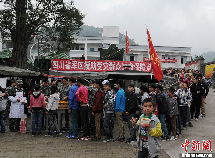 4月30日,四川芦山震灾区龙门乡红星村隆兴中心校的孩子们没有放假,他们在学校进行心理咨询和军训活动。芦山“4.20”7级强震发生后,在乐山政府和军分区官兵的帮助下,受损的校园里建起了1100平方米的板房教室,536名学生踏进板房学校开始了新的课程,校园内外再次传出孩子们的欢笑和读书声。图为排队打饭的孩子们。中新社发 刘忠俊 摄