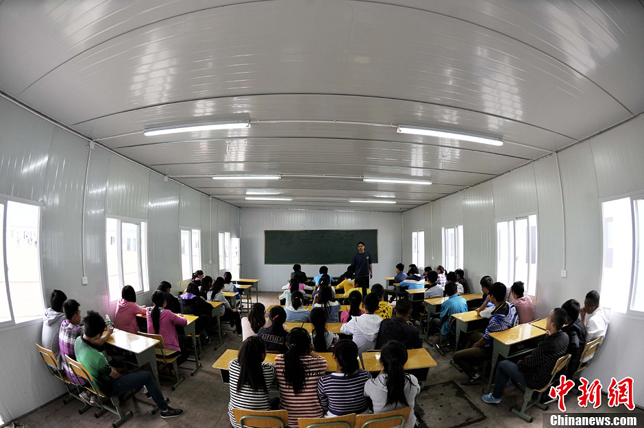 4月30日,在震中龙门中心学校的塑胶球场上来自该校的300多名师生及百余名参与援建的部队官兵参加了由成都军区空军第九工程总队援建的震中龙门最大的板房学校——晨阳希望学校正式落成仪式。在落成仪式上部队同时向学校捐赠了400套课桌椅及学习用具。随后该校部分年级学生在新校舍里复课。图为学生们在新教室里上课。中新社发 安源 摄