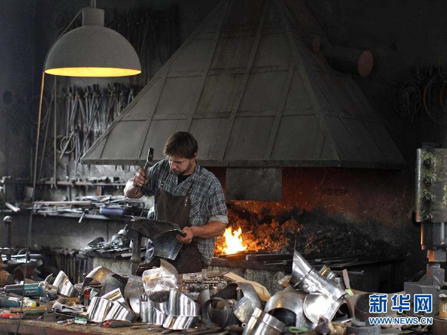 2012年6月12日,在奥地利莫尔恩,铁匠格奥克·施米德贝格尔在他的工坊里为梵蒂冈的卫队打制甲胄。奥地利铁匠兄弟约翰·施米德贝格尔和格奥克·施米德贝格尔是第5代家族传人,他们专门为梵蒂冈定制的手工甲胄严格遵循500年来的传统,每一件都需要花120个小时来打造。图片来源:新华网