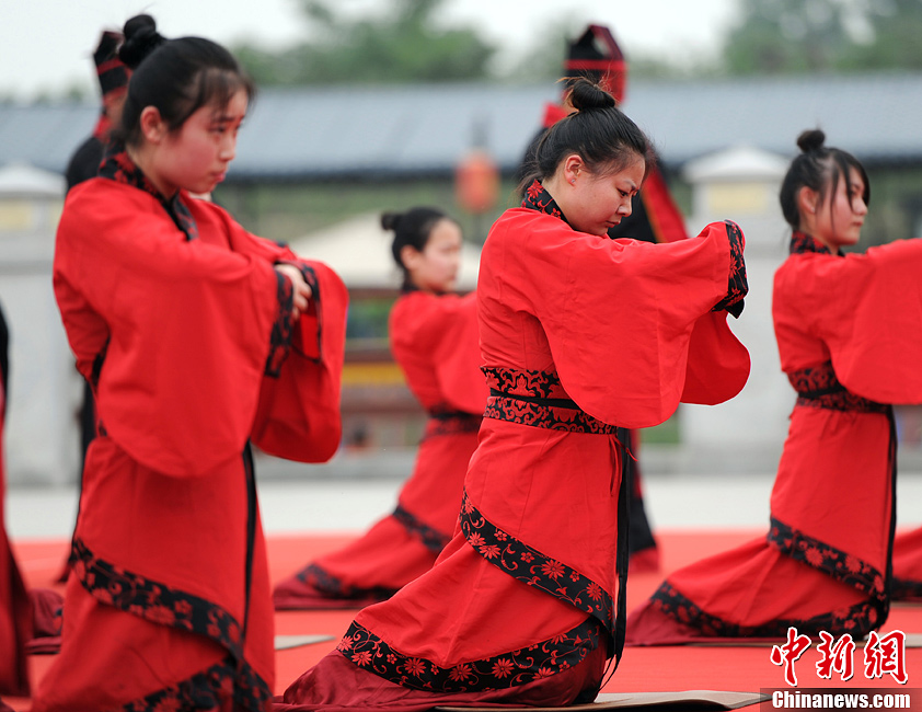 5月1日,在西安汉长安城遗址外的汉城湖景区,近40名年轻人身着汉服,仿照古代习俗举行了自己的成人礼,吸引了大量游人驻足围观。汉族的成人礼延续数千年,冠笄之礼成为其核心内容,男子加冠,女子加笄。行冠笄礼者由此变为担当家庭与社会责任的成年人。图为仪式现场。张远 摄