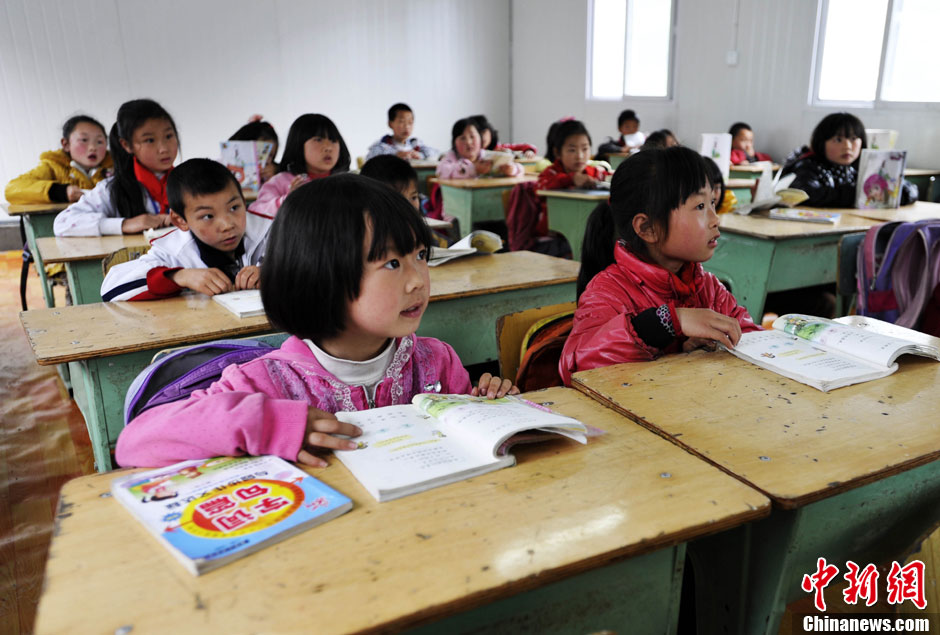 5月2日,震中四川芦山太平乡雨后初晴,高家扁山岰飘荡着孩子们稚嫩的歌声,一所崭新的板房学校——太平乡中心学校建成。至此,由成都军区空军承建的3所板房学校全部移交地方,共有2000多名学生回归学校。图为震区孩子在新板房教室上课。中新社发 安源 摄