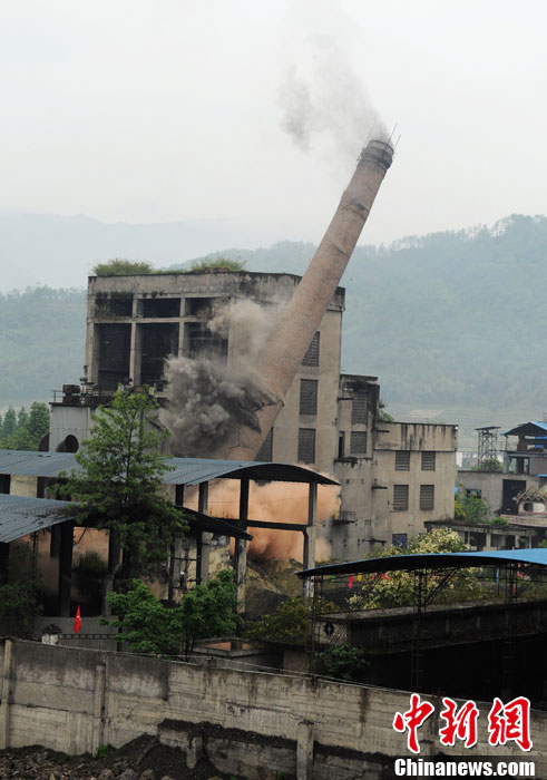 5月2日,四川天全县始阳镇一废弃水泥厂高68米的烟囱被爆破拆除。该烟囱在芦山“4.20”7级强震中受损,因其紧邻震后修建的板房学校,当地将受损烟囱爆破拆除,消除隐患。中新社发 刘忠俊 摄