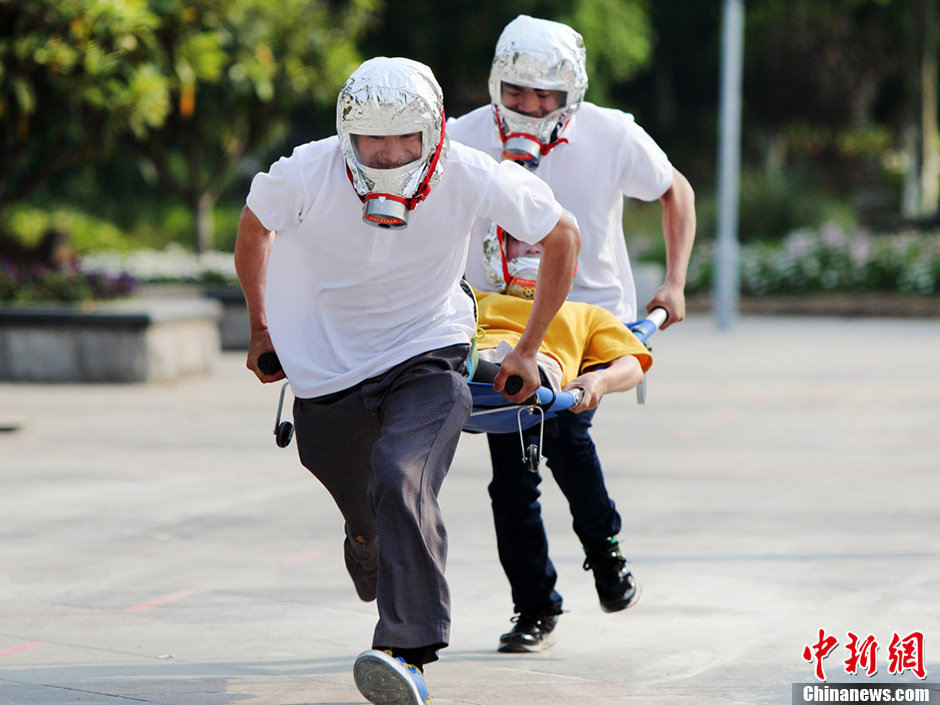5月2日,一场别开生面的消防运动会在江苏南京金陵会议中心举行,灭火接力赛、水带冲锋赛、力拔千斤等具有较强趣味性的比赛,吸引了会议中心和金陵江滨酒店的数百名员工前来参加,中年长者的智慧风趣、小伙子们的果敢勇猛、女选手的巾帼不让须眉,寓教于乐的比赛不仅锻炼的身体,也增强了个人的消防技能和消防安全意识。图为头戴“防火面具”的选手正在冲刺。苏阳 摄