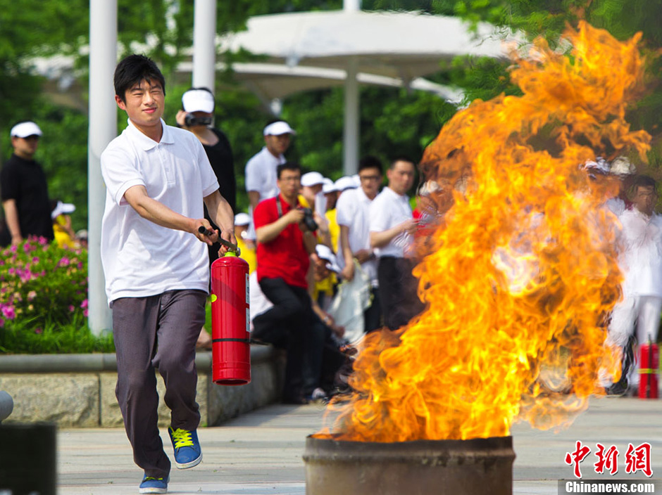 5月2日,一场别开生面的消防运动会在江苏南京金陵会议中心举行,灭火接力赛、水带冲锋赛、力拔千斤等具有较强趣味性的比赛,吸引了会议中心和金陵江滨酒店的数百名员工前来参加,中年长者的智慧风趣、小伙子们的果敢勇猛、女选手的巾帼不让须眉,寓教于乐的比赛不仅锻炼的身体,也增强了个人的消防技能和消防安全意识。图为选手在激烈比赛中。苏阳 摄