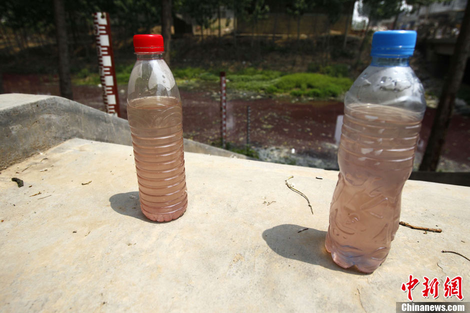 5月3日,河南新乡西孟姜女河约2公里的河段呈现红色,被民众称为“血河”,当地采取措施将红色的河水抽到污水管网,排到污水处理厂进行处理。中新社发 王中举 摄