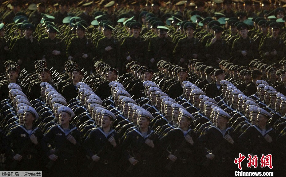 5月3日,俄罗斯官兵在莫斯科红场进行胜利日阅兵式夜间彩排。 5月9日是俄罗斯卫国战争胜利日,首都莫斯科红场阅兵仪式是当天的主要庆祝活动。今年将有11000多名俄官兵及军校学生参加阅兵式,并将展示101种现代武装装备。