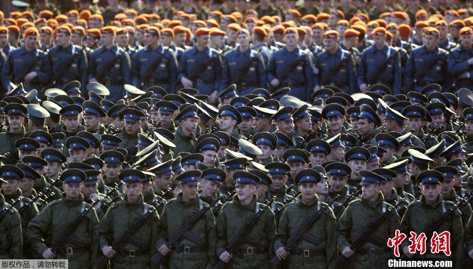 5月3日,俄罗斯官兵在莫斯科红场进行胜利日阅兵式夜间彩排。 5月9日是俄罗斯卫国战争胜利日,首都莫斯科红场阅兵仪式是当天的主要庆祝活动。今年将有11000多名俄官兵及军校学生参加阅兵式,并将展示101种现代武装装备。
